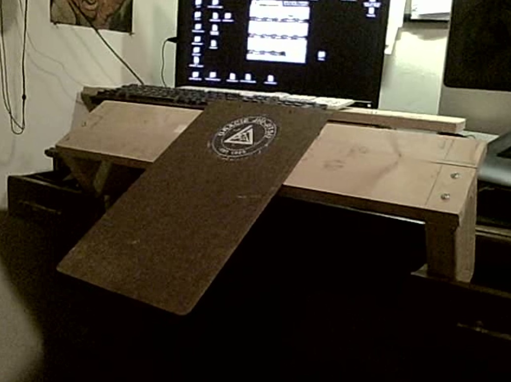 My drawing board. I have limited space. I built this one-by-six spanner to go between drawers on my desk. It's very solid at the tilt shown. Then I use one clipboard to attach to the one by six, and then attach a second clip board to the bottom clip board. Very sturdy. Perfect for what I'm up to. Actually the best sketching ergonomics I've ever devised for myself.